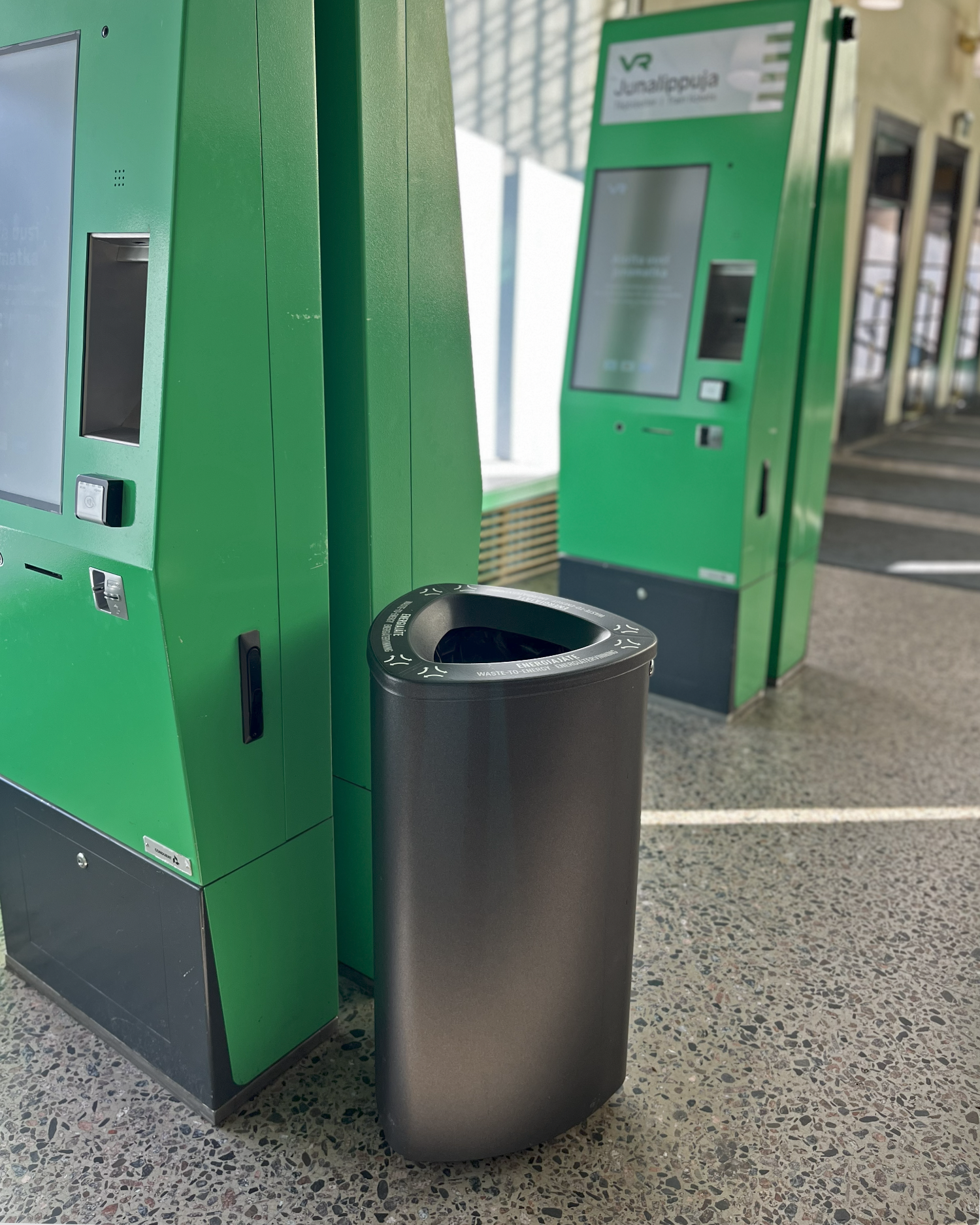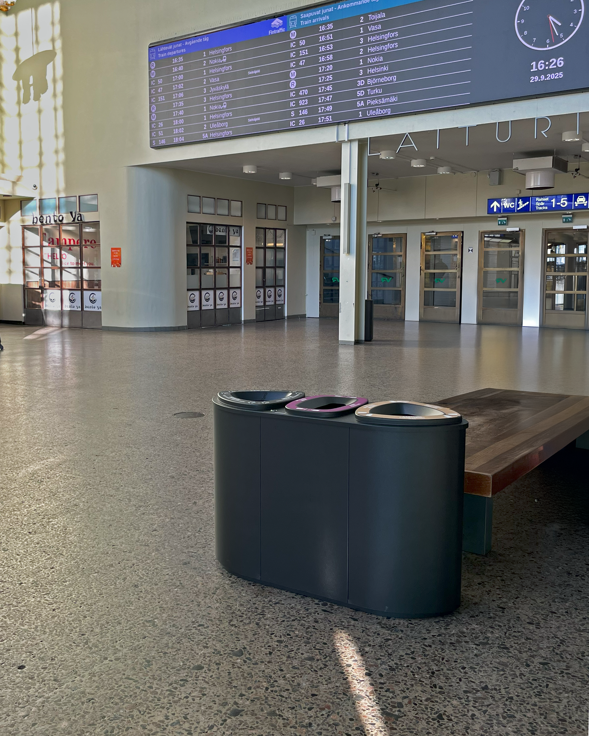 Lehtovuori toimitti aseman sisätiloihin modernit Bermuda-lajitteluastiat, jotka on varustettu selkeillä ja hyvin näkyvillä lajittelutarroilla. Tarrat opastavat matkustajia intuitiivisesti oikeaan lajitteluun ja tekevät kierrättämisestä helppoa, käyttäjäystävällistä ja nopeaa myös kiireisessä asemaympäristössä. Ratkaisun ansiosta matkustajat voivat kierrättää jätteensä oikein ilman epäröintiä, mikä lisää aseman siisteyttä. Bermuda-roska-astia on tyylikäs ja käytännöllinen ratkaisu julkisiin tiloihin, kuten rautatieasemille, bussiterminaaleihin ja lentokentille, joissa siisteys, selkeys ja sujuva kierrätys ovat osa hyvää matkustuskokemusta.