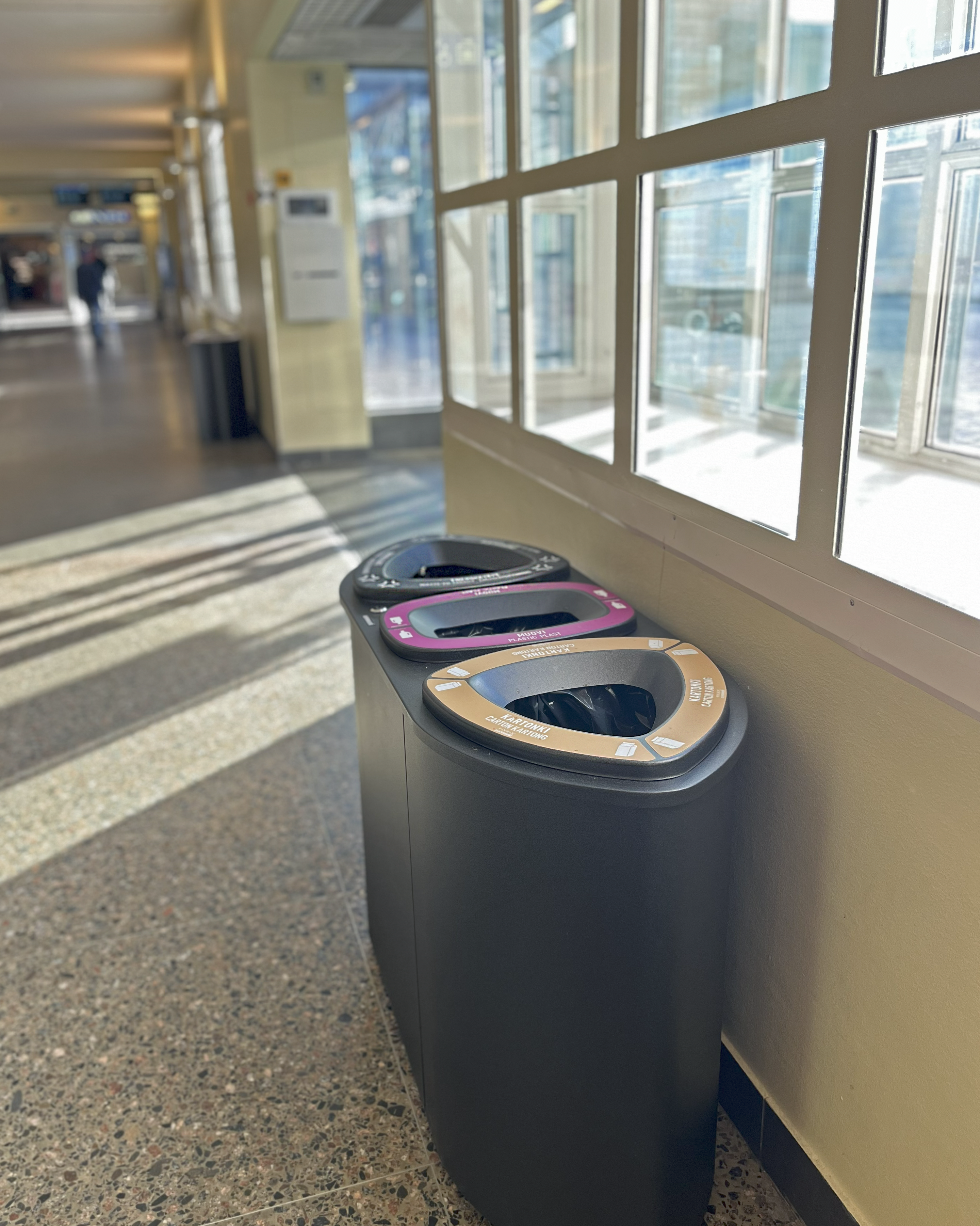 Kierrätys ja lajittelu Tampereen rautatieasemalla – Lehtovuoren Bermuda-lajitteluastiat