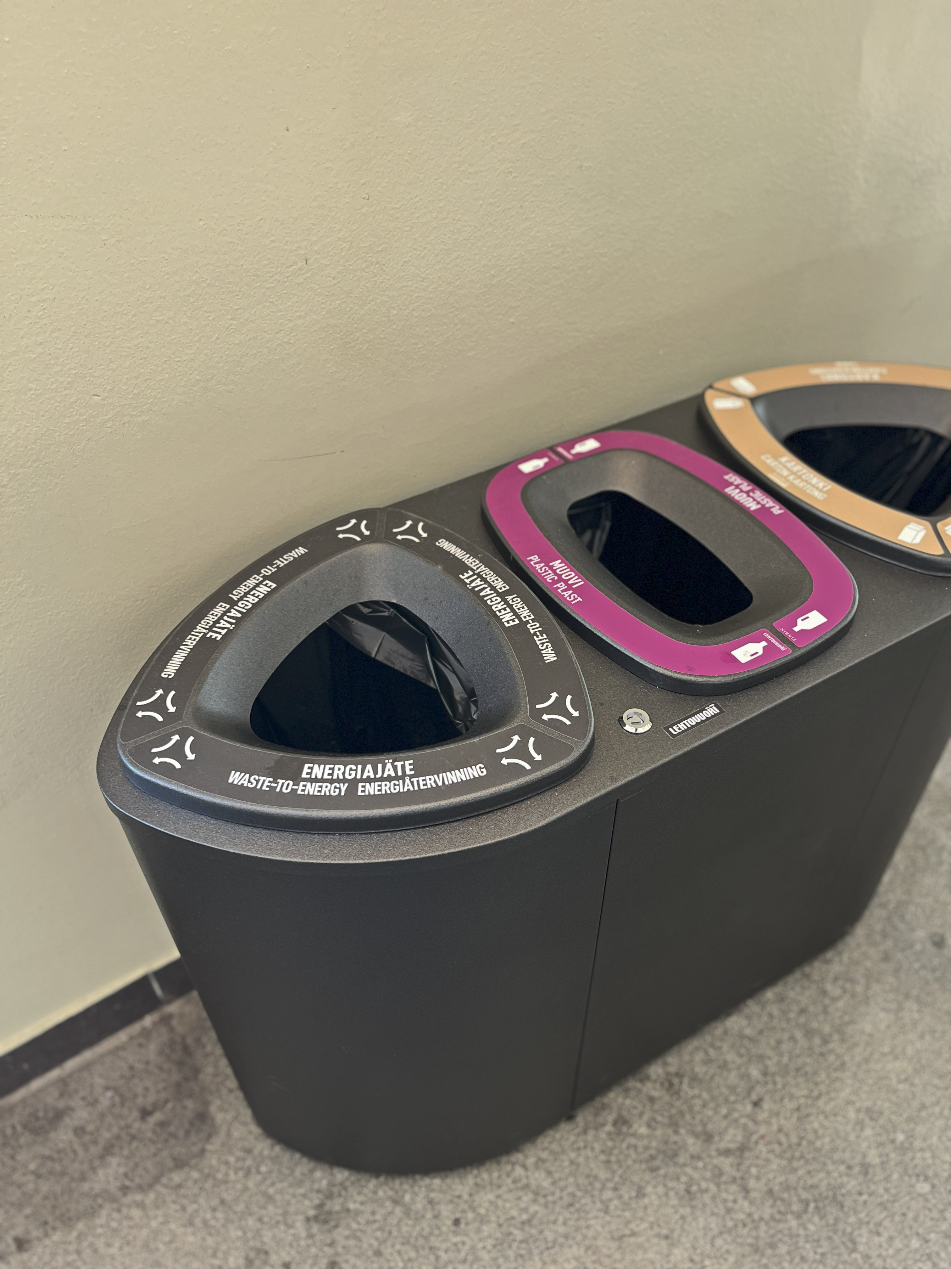 Kierrätys ja lajittelu Tampereen rautatieasemalla – Lehtovuoren Bermuda-lajitteluastiat - Lehtovuori